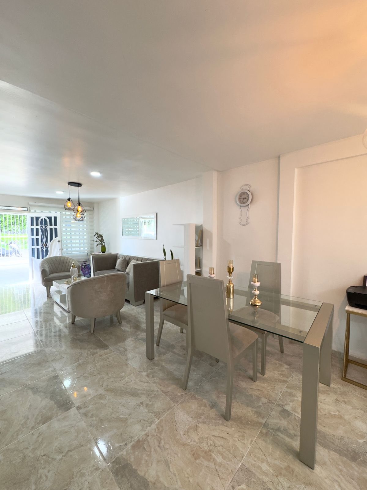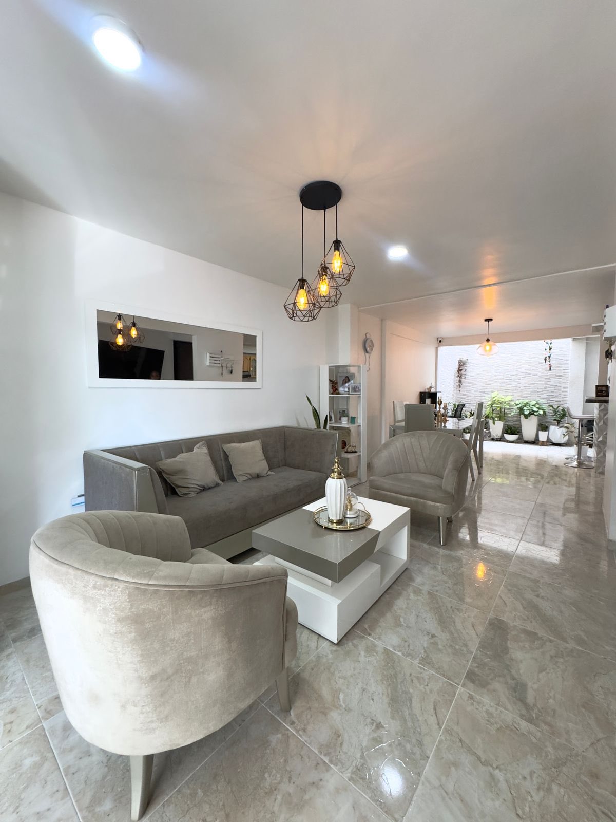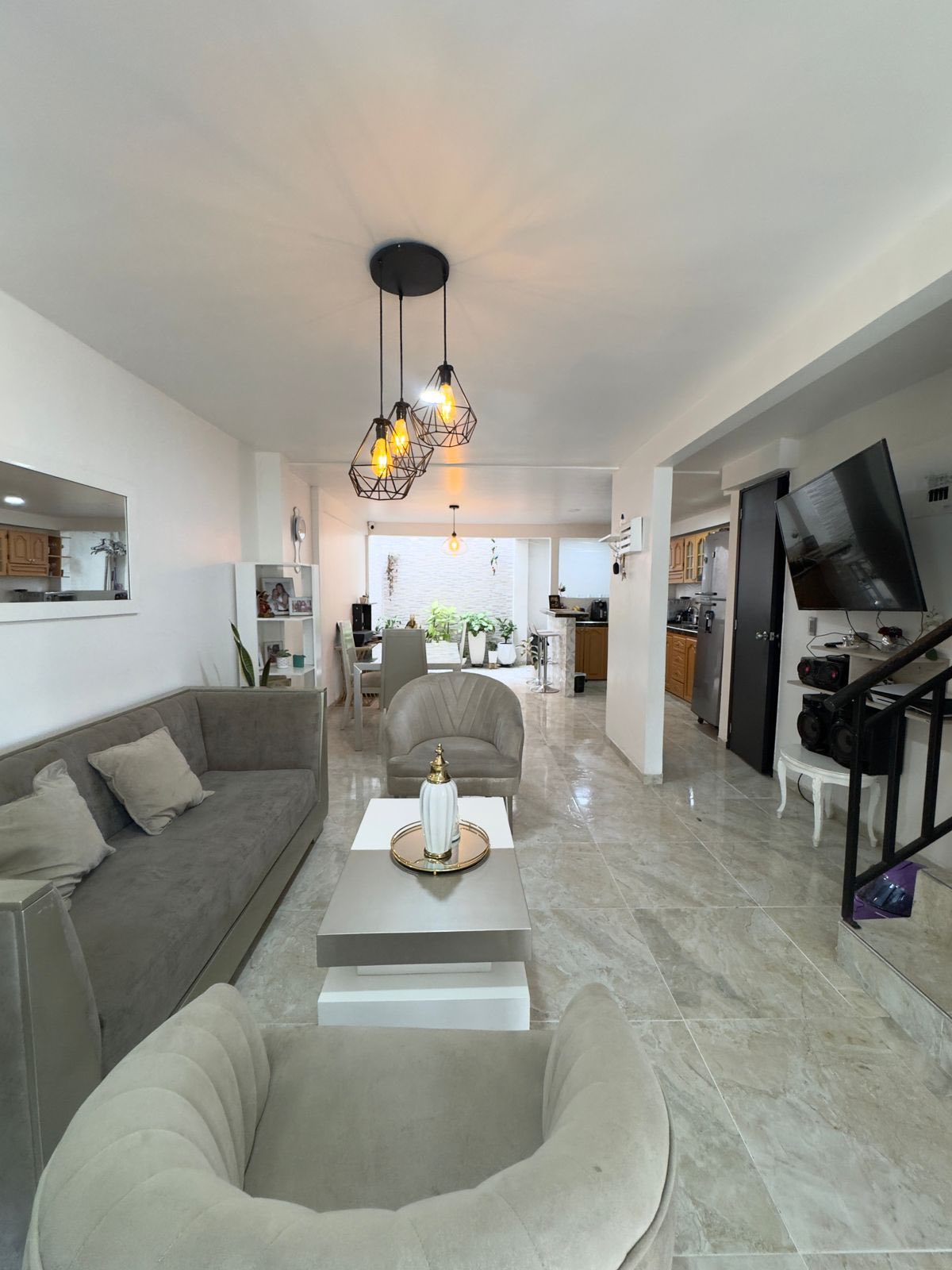 •PRIMER PISO Ante – jardín enchapado reja seguridad – techo Doble Garaje externo Sala – Comedor Sala TV Cocina integral Baño social Patio interior Zona de lavado •SEGUNDO PISO3 Habitaciones clóset ppal baño Baño auxiliar completo